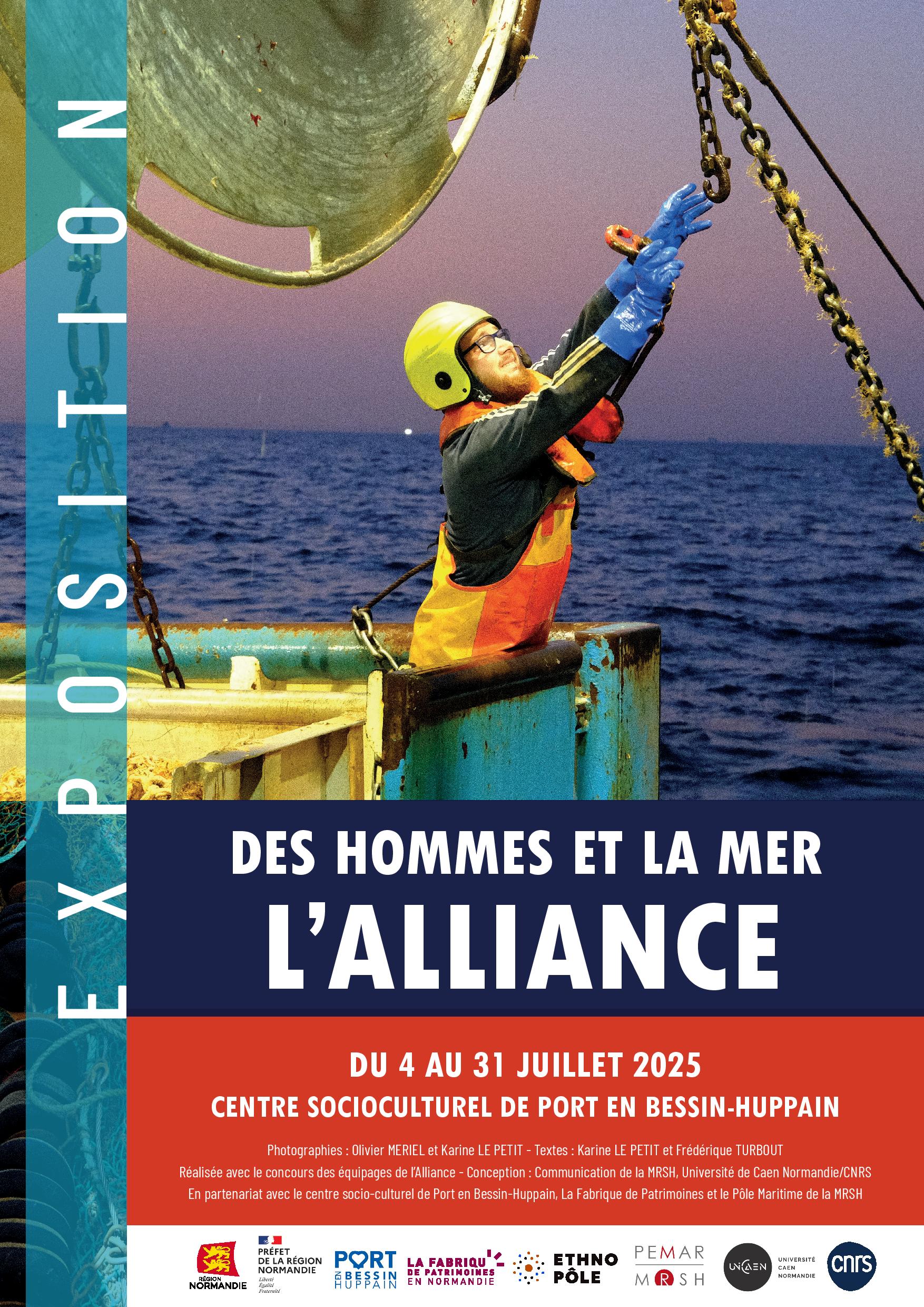 Karine Le Petit, ethnologue à la Fabrique de patrimoines en Normandie et Olivier Mériel, photographe, ont croisé leurs regards sur la pêche en choisissant comme point d’ancrage le chalutier de Port-en-Bessin-Huppain : l’Alliance. La dimension humaine du métier de marin pêcheur est au cœur de l’exposition, par le récit de la vie à bord : naviguer, pêcher, trier, conserver, réparer, ramender tout en entretenant le lien avec les familles à terre.